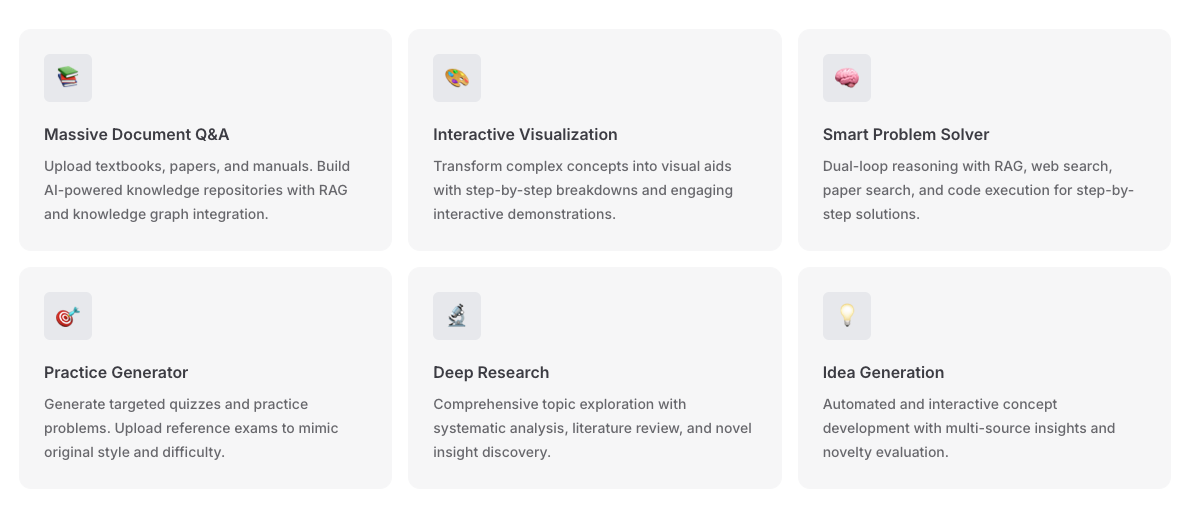 DeepTutor는 단순한 챗봇이 아닌, 목적에 따라 특화된 기능을 제공하는 통합 플랫폼입니다. DeepTutor의 주요 특징은 다음과 같습니다.