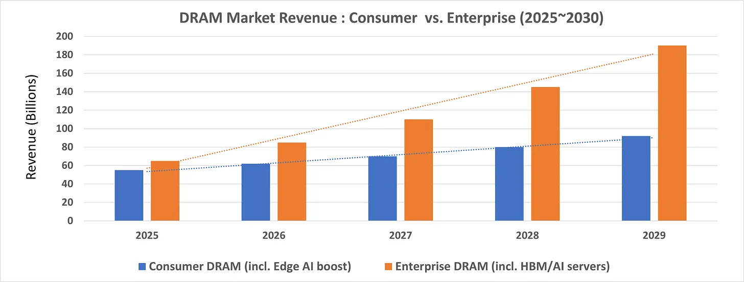 지정학적인 긴장 고조와 탐욕에 사로잡힌 AI 붐의 그림자 속에서, 반도체 산업은 지금 대대적인 변화를 겪고 있으며, 이는 빅테크 클라우드 제공업체들의 손에 AI 권력을 집중시키면서 여기저기 흩어져 있는 풀뿌리 혁신가들에게 압박이 될 가능성이 높은 리스크가 있습니다. 이제 2025년 말에 접어들면서 최근 DRAM 제품의 가격 급등은 그냥 단순한 시장 변동이 아닙니다. 이는 마이크론, 삼성, SK하이닉스 같은 거대 기업들이 빅테크의 AI 데이터센터 증설에 대한 수요를 이유로 마진이 높은 엔터프라이즈 제품인 High Bandwidth Memory(HBM)로 의도적으로 사업 전략 방향을 전환한 파장으로, 일반 소비자와 로컬 AI 개발자들을 소외시키고 있습니다. 이 움직임은 표면적으로는 서구 빅테크들의 AI 데이터 센터 수요로 인한 것으로 보이지만, 탈중앙화된 컴퓨팅을 통해 가능한 표현의 자유를 억압하여 결과적으로 서구 AI 산업의 장기적 생존을 약화시킬 수 있는 리스크를 내재하고 있습니다. 먼저 현황부터 살펴봅시다.