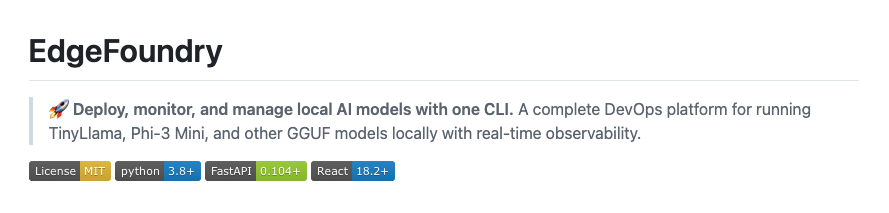 EdgeFoundry는 로컬 환경에서 AI 모델을 배포, 모니터링, 관리할 수 있는 통합 DevOps 플랫폼입니다. TinyLlama, Phi-3 Mini 같은 경량 GGUF 모델을 대상으로 단순 실행 이상의 기능을 제공하며, 개발자가 모델 로딩, API 서버 구성, 성능 모니터링 등 번거로운 작업을 따로 신경 쓰지 않아도 되도록 만들어졌습니다. 이 프로젝트의 핵심 가치는 “로컬에서 간단하고 직관적으로 AI 모델을 실행하고 운영할 수 있는 경험”을 제공하는 데 있습니다.
