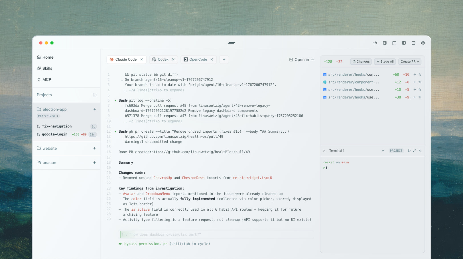 작업이 완료되면 Emdash 내에서 직접 변경 사항을 검토(Diff Review)하고, 수정이 필요하면 에이전트에 추가 지시를 내리거나, CI/CD 상태를 확인하고 Pull Request를 생성할 수 있습니다. 이 모든 과정이 하나의 데스크탑 애플리케이션 안에서 이루어집니다.