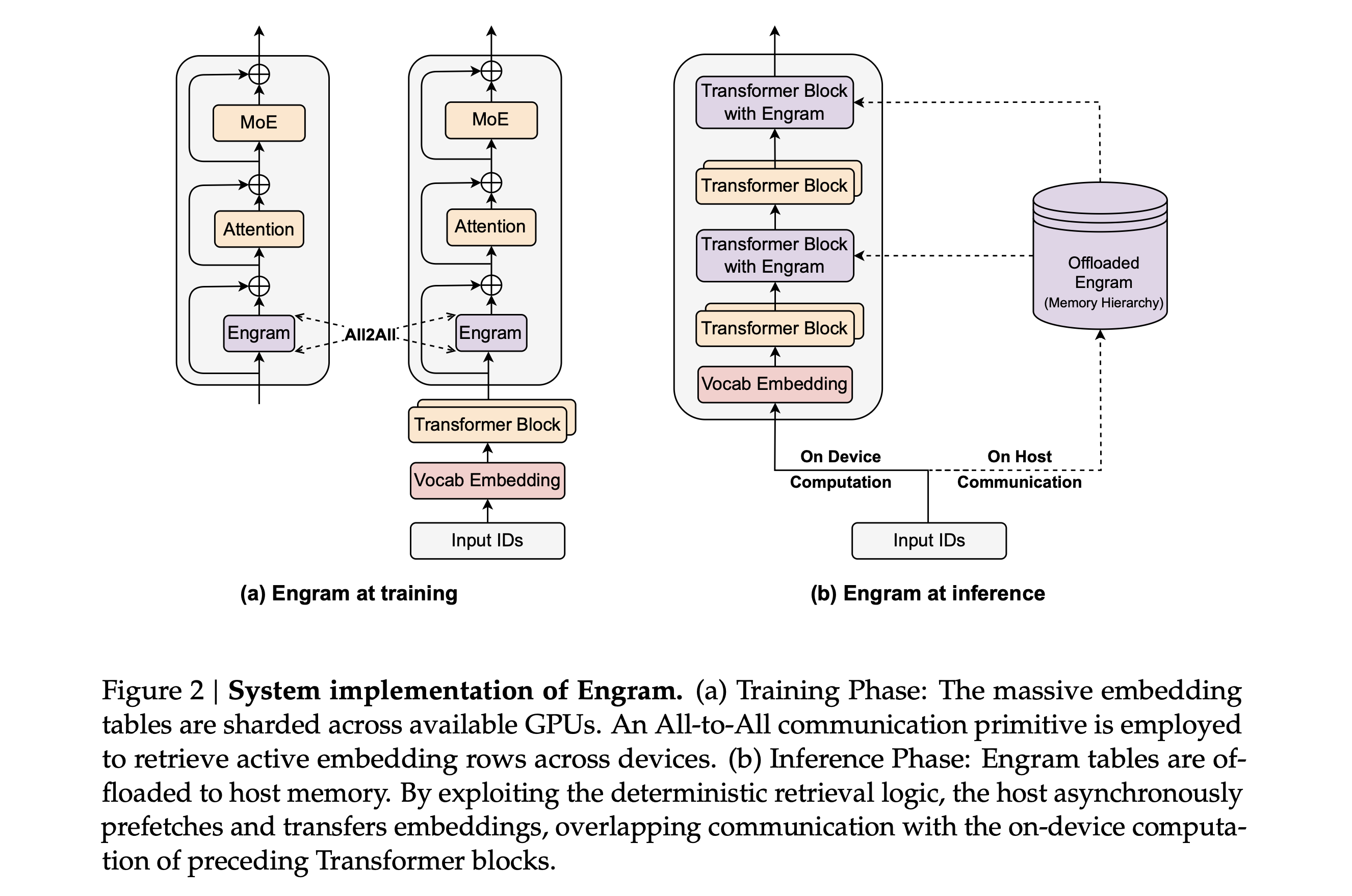Engram은 시스템 관점에서도 매우 효율적으로 설계되었습니다. MoE의 라우팅이 런타임에 결정되는 동적인 과정인 것과 달리, Engram의 주소 지정은 입력 토큰만 알면 미리 알 수 있는 결정론적(Deterministic) 특성을 가집니다.
