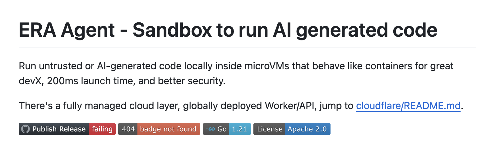 Cloudflare Workers 통합: ERA Agent는 Cloudflare Workers와 통합하여 배포할 수 있도록 설계되었습니다. 이를 통해 서버리스 환경에서도 상태가 유지되는(Durable Objects) 샌드박스 환경을 구축할 수 있으며, 엣지(Edge)에서 AI 코드를 안전하게 실행하는 백엔드를 구성할 수 있습니다.