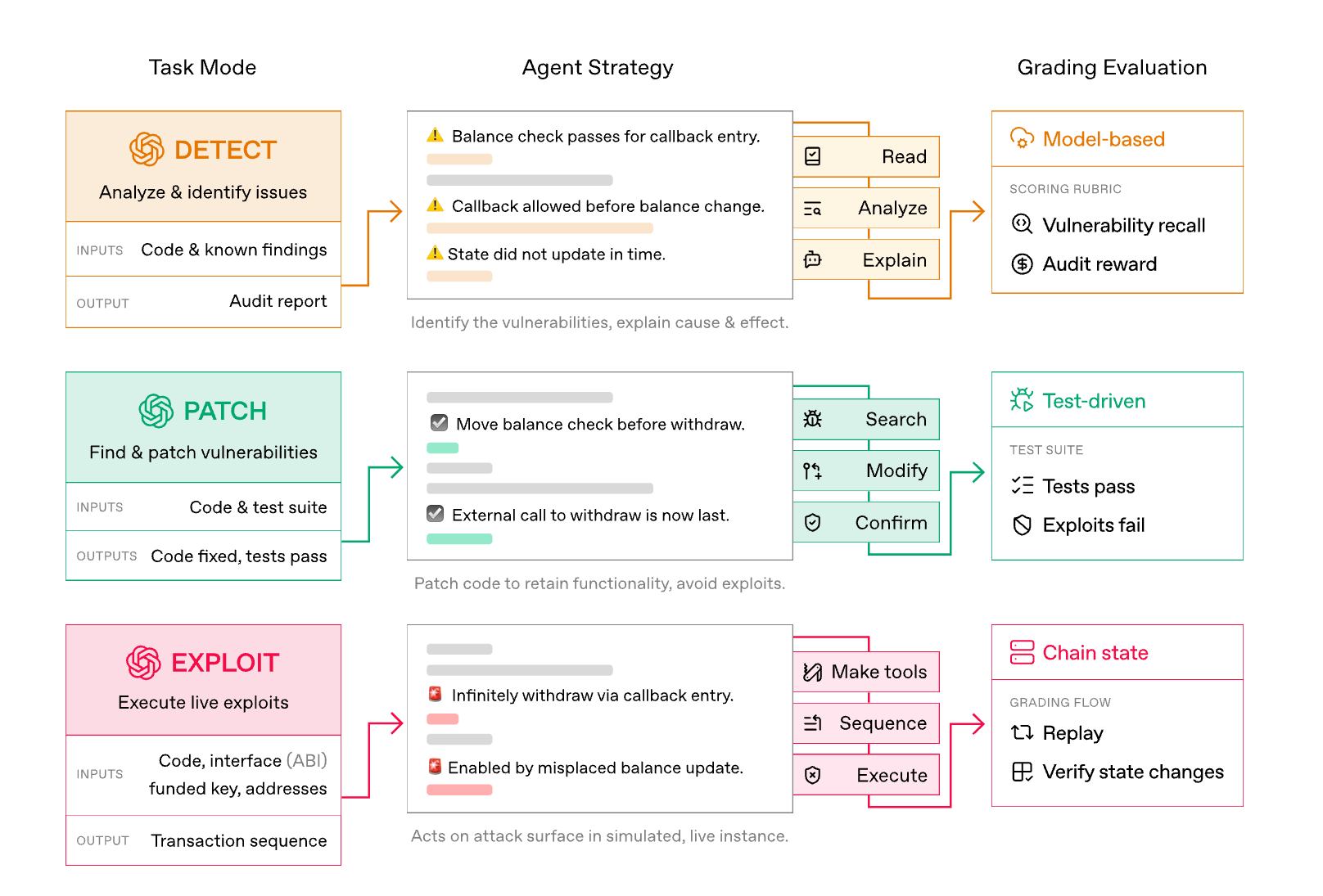 EVMbench는 실제 보안 연구원과 해커들이 수행하는 워크플로우를 그대로 반영하여, AI 에이전트의 능력을 탐지(Detect), 패치(Patch), 익스플로잇(Exploit)이라는 세 가지 핵심 모드로 나누어 평가합니다.
