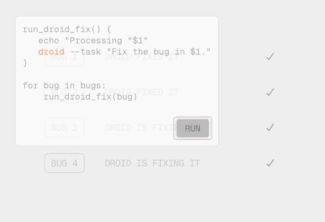 Command Line (CLI): 대규모 스케일의 자동화에 최적화된 CLI 환경을 제공합니다. 맥(macOS), 리눅스, 윈도우 환경 모두 지원하며 curl -fsSL https://app.factory.ai/cli | sh 명령어로 간단히 설치할 수 있습니다. CI/CD 파이프라인 연동, 대규모 코드 마이그레이션, 자동화된 코드 리뷰 및 자가 복구(Self-healing) 빌드 등 개발 주기의 모든 단계에 에이전트를 스크립팅하고 병렬로 실행할 수 있습니다.