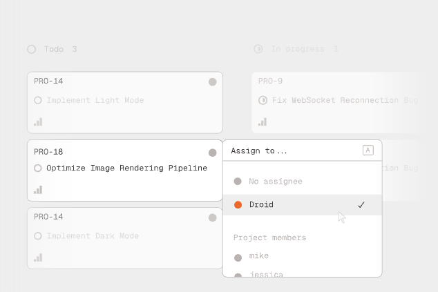 Project Manager: Linear와 같은 이슈 트래커 도구와 긴밀하게 연동되어 백로그 관리를 자동화합니다. 이슈가 할당되거나 멘션이 발생하면 Droid가 자동으로 문맥을 파악하고, 솔루션을 구현한 뒤 Pull Request(PR)까지 생성하여 티켓 발급부터 코드 병합까지의 완벽한 추적성을 보장합니다.