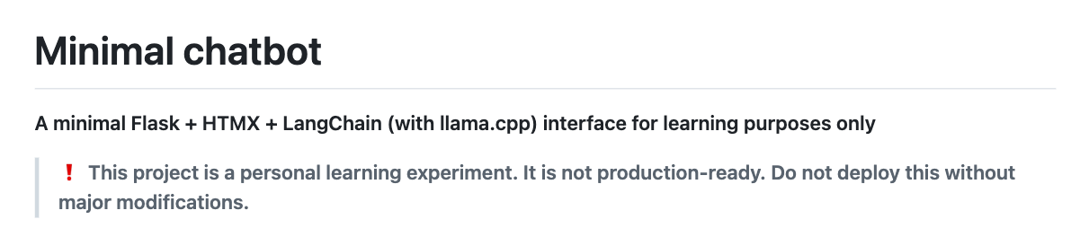 flask-htmx-llm 프로젝트는 학습용 실험에 초점을 맞추고 있으며, 다음과 같은 이유로 프로덕션에는 부적합합니다: