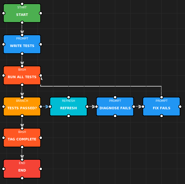 사용자는 프롬프트 전송, Bash 명령어 실행, 분기 처리(Branching) 등의 작업을 블록 형태로 배치하여 자신만의 '코딩 에이전트' 워크플로우를 만들 수 있습니다. 이는 단순한 코드 생성을 넘어, AI가 코드를 작성하고(Implement), 테스트하며(Test), 오류를 수정하는(Fix) 일련의 과정을 자동화된 루프(Loop)로 구현할 수 있게 돕습니다.