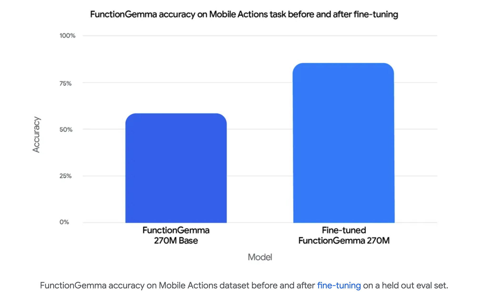 모바일 환경에서의 액션 수행 능력을 평가한 결과, 파인튜닝 후 신뢰도가 대폭 상승(Baseline 58% -> 85%)하여 상용 수준의 성능을 입증했습니다. FunctionGemma 모델의 파인튜닝에 대해서는 예시 노트북을 참고해주세요.