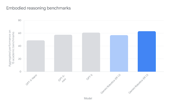 Google DeepMind는 ER 1.5를 ERQA(Embodied Reasoning Question Answering), Point-Bench를 포함한 15개 학술 벤치마크에서 평가했으며, 공간 이해·시각 질의응답·비디오 질의응답 등에서 최신 최고 성능(state-of-the-art)을 기록했습니다. ERQA는 로봇이 “이 물체를 어디에 두어야 하는가?” 같은 질문에 답하는 능력을 평가하며, Point-Bench는 로봇이 특정 위치를 가리키거나 물체의 공간 좌표를 정확히 인식하는 능력을 평가하는 벤치마크입니다.