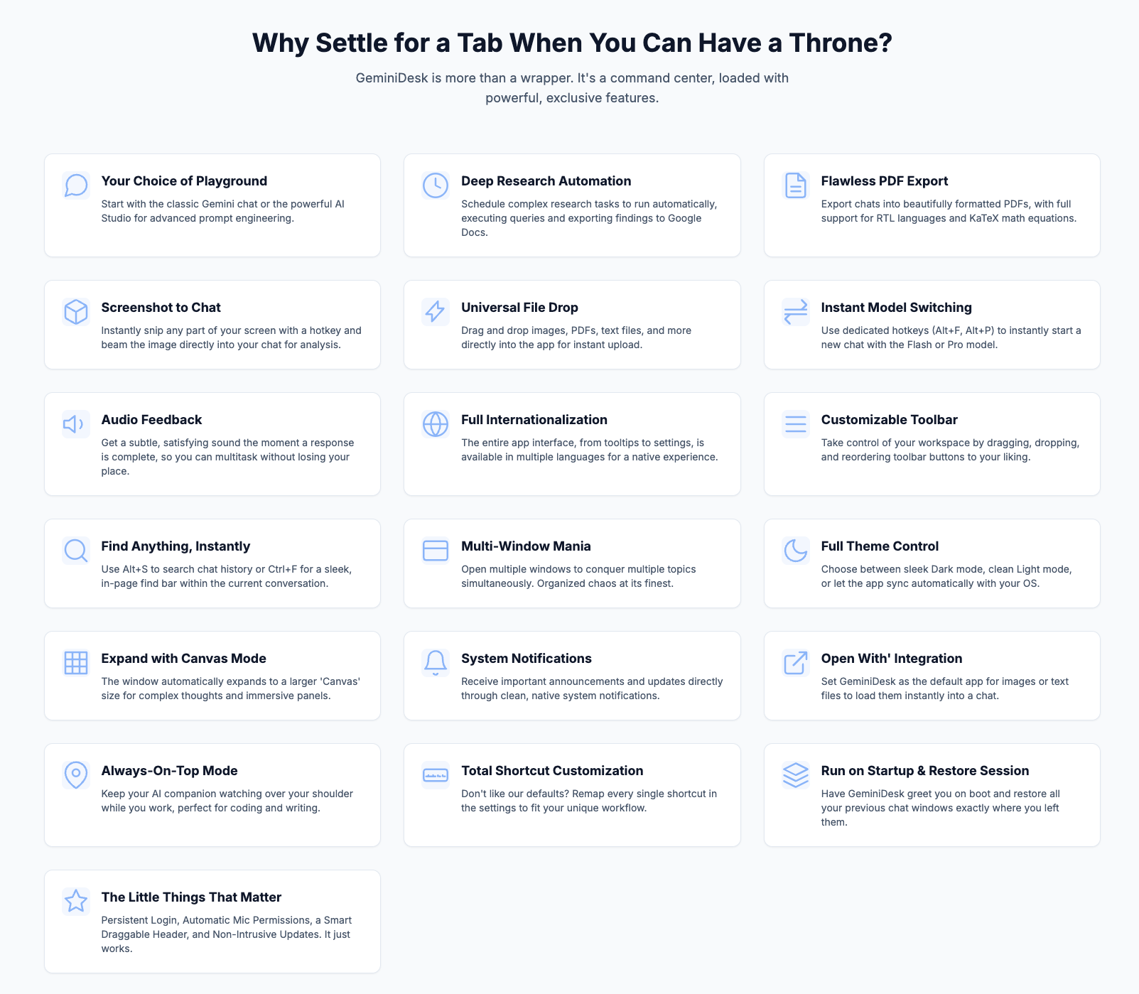오늘날 많은 사용자가 구글 Gemini를 웹 브라우저를 통해 사용하지만, 여러 탭 속에서 잦은 전환이 일어나며 집중력을 잃기 쉽습니다. GeminiDesk는 이런 문제를 해결하기 위해 등장했습니다. AI와의 대화를 전용 앱에서 수행할 수 있도록 하여, 사용자가 방해받지 않고 더 깊이 있는 연구, 코딩, 글쓰기 등을 할 수 있게 도와줍니다.