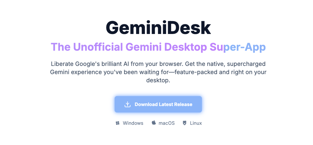 GeminiDesk는 구글의 AI인 Google Gemini를 브라우저 탭의 제약에서 해방시켜, 완전한 데스크톱 애플리케이션 형태로 사용할 수 있게 만든 비공식 데스크톱 클라이언트(Unofficial Gemini Desktop App)입니다. 단순히 웹을 감싼 래퍼 수준이 아닌, 실제로 AI 생산성을 극대화할 수 있는 다양한 기능과 사용자 경험(UI/UX)을 제공합니다.