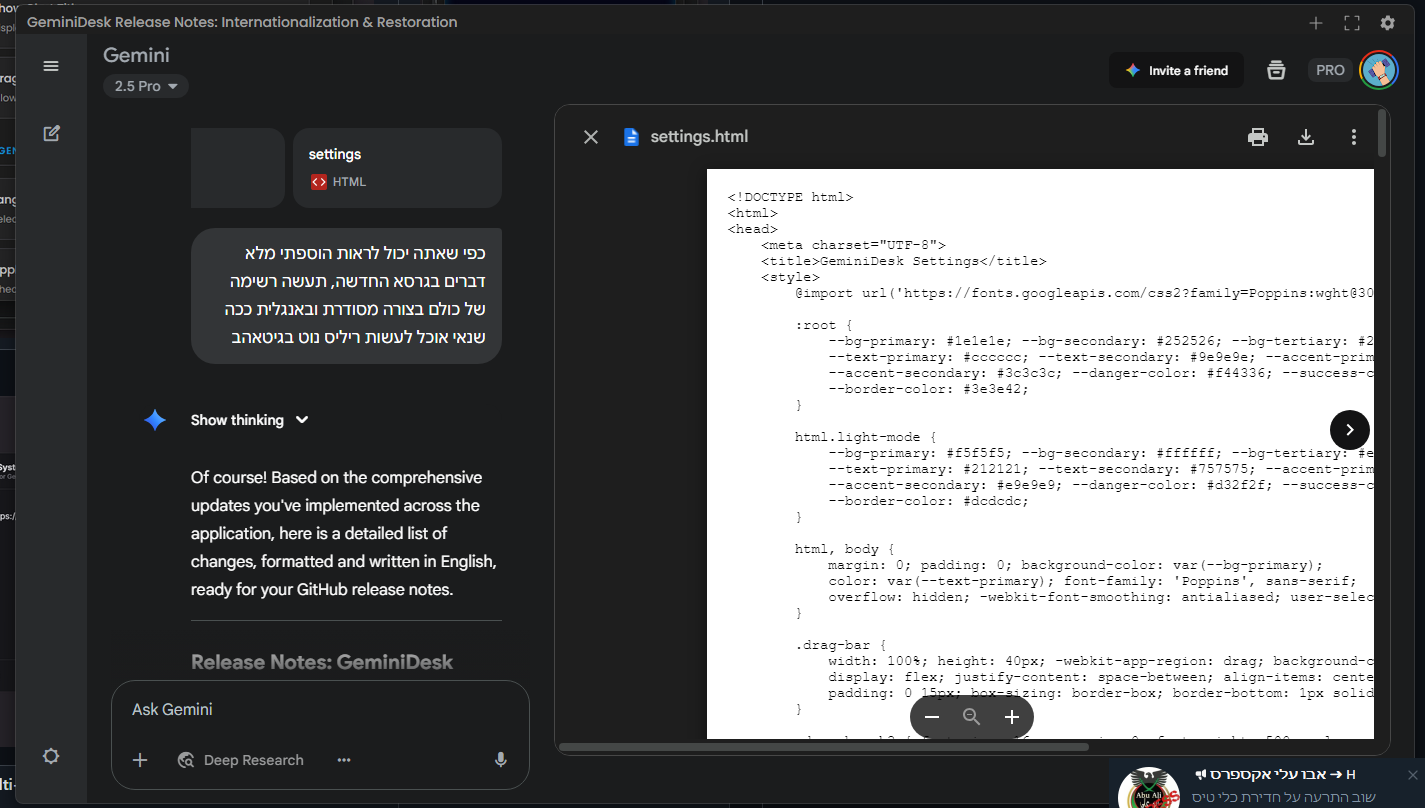 PDF 내보내기 및 수식 지원: GeminiDesk는 PDF 내보내기 기능을 통해 대화 내용을 완벽하게 정리된 문서로 저장할 수 있습니다. RTL 언어(히브리어, 아랍어) 지원은 물론, KaTeX 기반 수식 렌더링이 포함되어 있어 연구 문서나 기술 보고서 작성 시 매우 유용합니다.