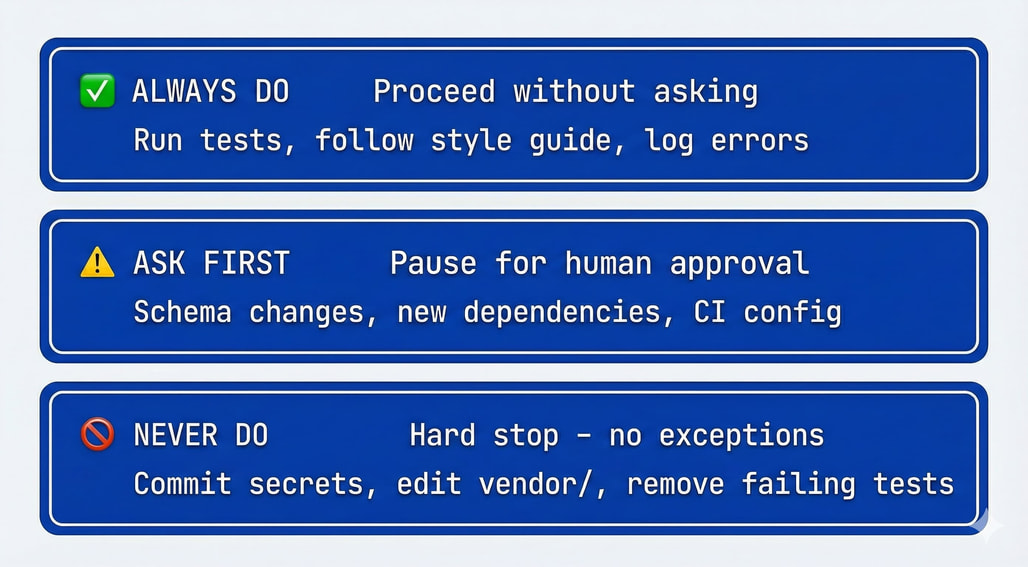 (요약 TOC, 서브에이전트, 병렬 오케스트레이션은 대규모 스펙을 다루기 위한 실질적인 수단) - 3단계 경계(Always / Ask first / Never), 자가 검사, 적합성 테스트를 통해 AI가 빠지기 쉬운 함정을 미리 차단