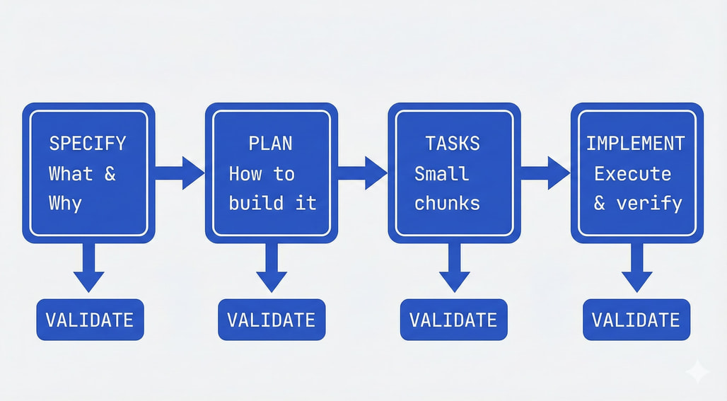- GitHub Spec Kit는 스펙을 엔지니어링 프로세스의 중심에 두는 4단계 게이트 워크플로우를 사용