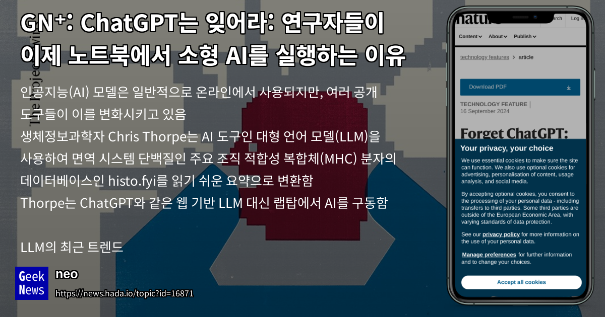 - 생체정보과학자 Chris Thorpe는 AI 도구인 대형 언어 모델(LLM)을 사용하여 면역 시스템 단백질인 주요 조직 적합성 복합체(MHC) 분자의 데이터베이스인 histo.fyi를 읽기 쉬운 요약으로 변환함