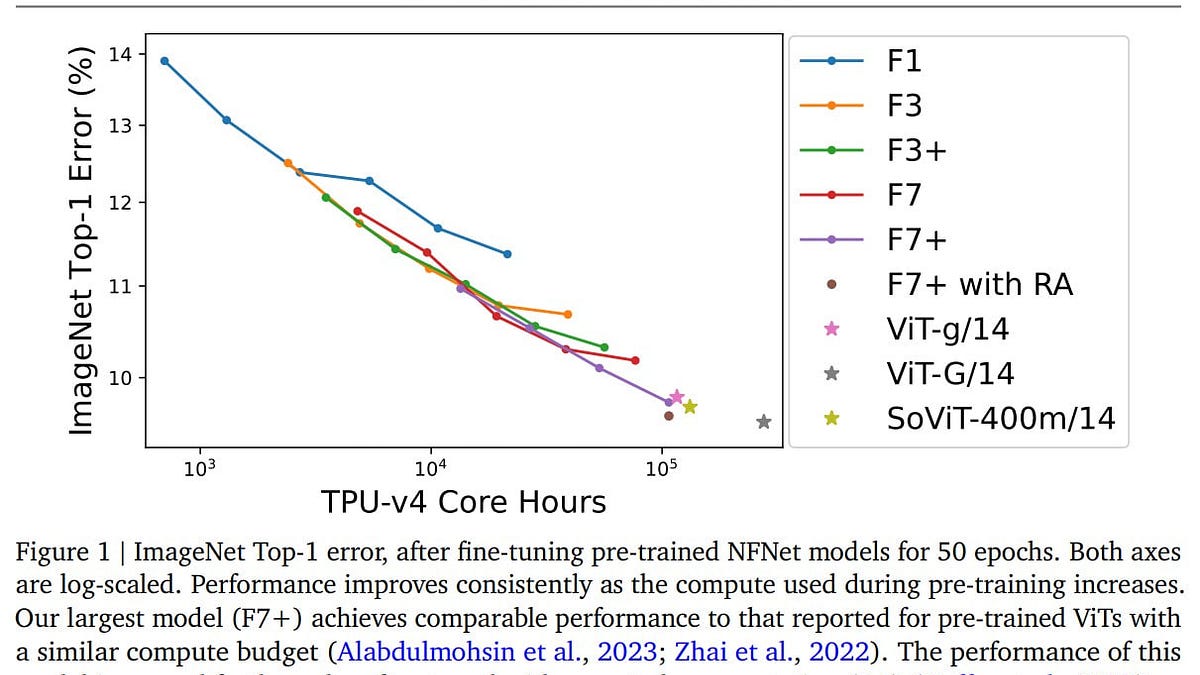 - 저자들은 NFNet (Normalizer-Free ResNets) 패밀리를 사용하여 망의 넓이/깊이를 점진적으로 증가시킴
