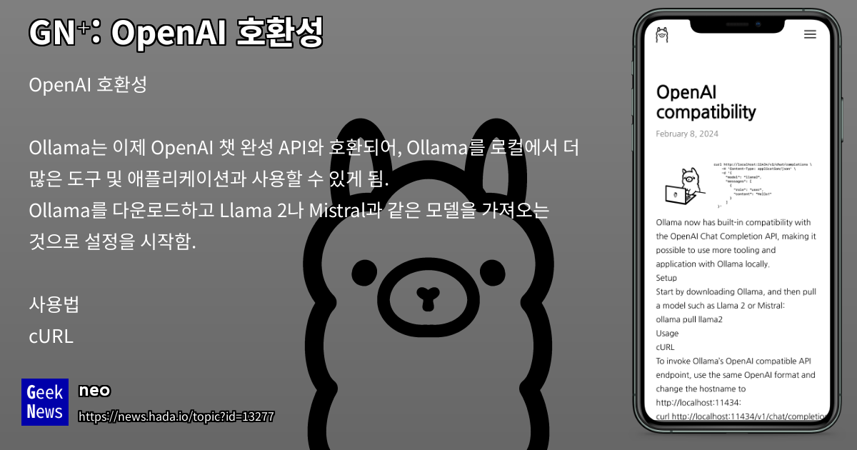 - Ollama는 이제 OpenAI 챗 완성 API와 호환되어, Ollama를 로컬에서 더 많은 도구 및 애플리케이션과 사용할 수 있게 됨.
