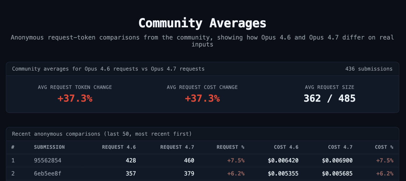 - 실제로 집계해보니 Opus 4.7은 Opus 4.6 대비 평균 요청 토큰과 평균 요청 비용이 각각 +37.4% 증가