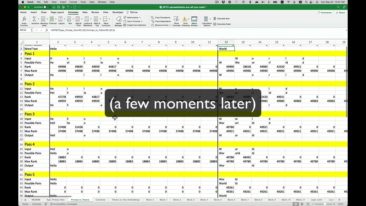 GPT-2의 Forward Pass를 외부 API 호출없이 엑셀 함수만으로 구현