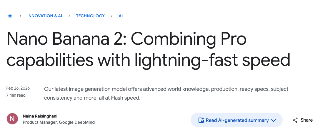 AI 이미지 생성 기술은 개발자와 창작자들의 작업 방식을 근본적으로 혁신하며 빠르게 발전해 왔습니다. 특히 텍스트 프롬프트를 이해하고 고품질의 이미지를 생성하는 기술은 마케팅, 디자인, 데이터 시각화 등 다양한 산업 분야에서 필수적인 도구로 자리 잡았습니다. 이러한 흐름 속에서 Google은 사용자들의 복잡한 요구사항을 충족시키면서도 빠른 생성 속도를 보장하는 새로운 모델의 필요성을 지속적으로 인식해 왔습니다. 더불어 고해상도 이미지와 사실적인 렌더링, 그리고 일관성을 유지하는 생성형 AI 모델에 대한 수요가 그 어느 때보다 높아진 상황입니다. 이러한 배경 속에서 Google DeepMind는 최신 기술력을 집약한 혁신적인 이미지 생성 모델인 Nano Banana 2를 새롭게 발표하며 업계의 이목을 집중시키고 있습니다.