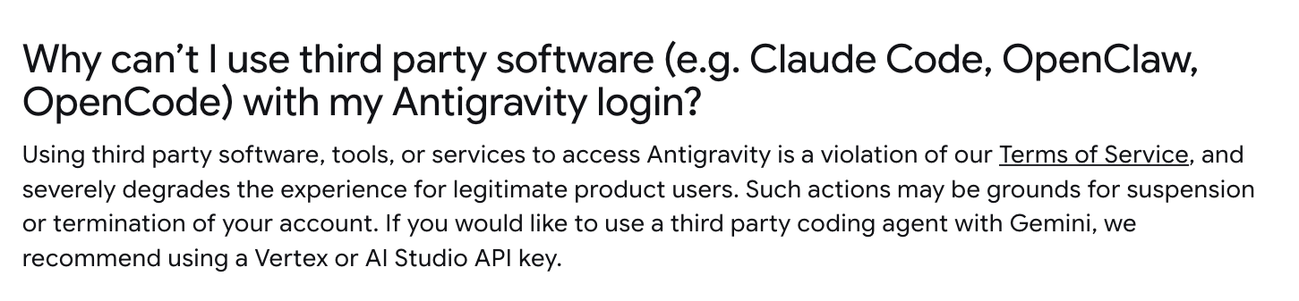 To maintain the integrity of Antigravity and ensure a great user experience for everyone, using third-party tools with your Antigravity login remains against our terms. We love seeing innovation and boundary-pushing in this community, and the Antigravity team is hyper-focused on building what you need to accelerate product development.