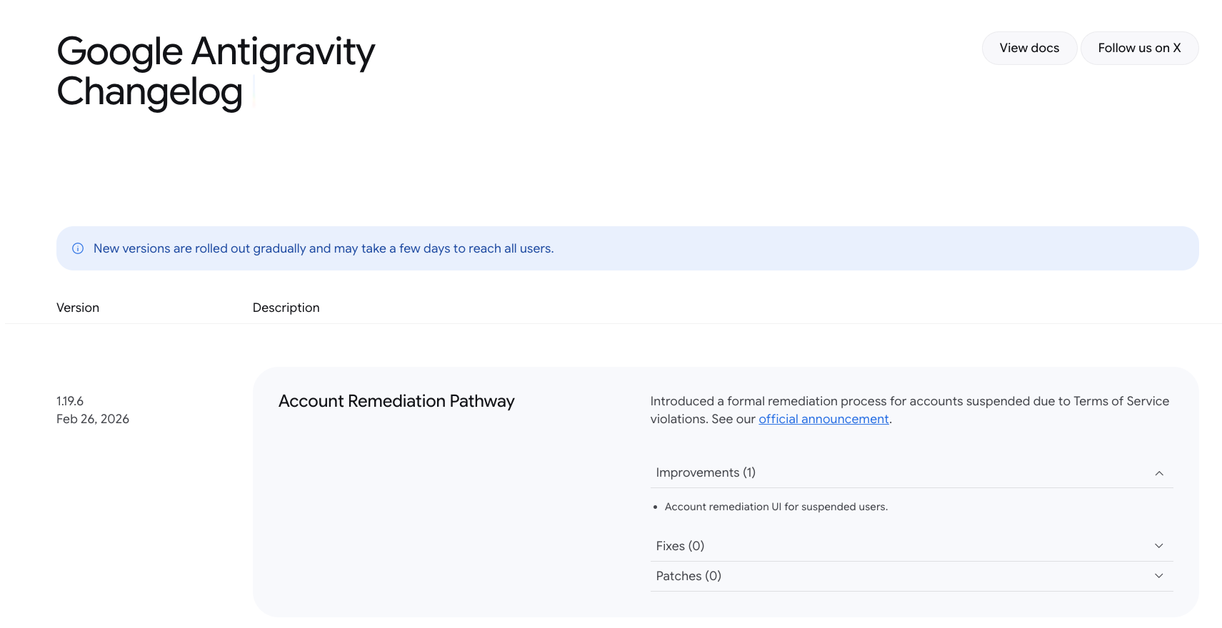 Antigravity를 새로 업데이트했더니, 다음과 같은 Changelog가 있었습니다: