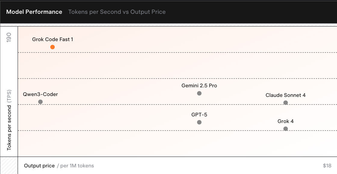 Grok Code Fast 1의 가장 큰 차별점은 응답 속도와 비용 구조입니다. 모델 추론 과정에서 프롬프트 캐싱(prompt caching) 기술을 적용해, 캐시 적중률이 90% 이상에 달하는 경우도 있어 반복적인 작업에서 체감 속도가 크게 향상됩니다. 벤치마크에 따르면 초당 약 190 토큰을 처리할 수 있으며, 이는 GPT-5, Claude Sonnet 4, Gemini 2.5 Pro와 비교했을 때 상당히 빠른 편에 속합니다.