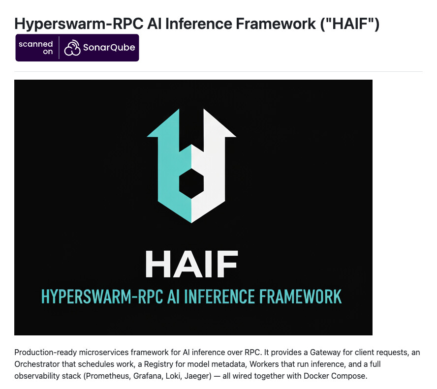 HAIF(Hyperswarm-RPC AI Inference Framework)는 AI 추론(AI Inference) 작업을 마이크로서비스 형태로 분산 처리할 수 있도록 설계된 프로덕션 수준의 프레임워크입니다. 이 프로젝트는 단순한 모델 서버가 아니라, 게이트웨이(Gateway), 오케스트레이터(Orchestrator), 레지스트리(Registry), 워커(Worker), 그리고 관측성(Observability) 구성 요소를 완비한 엔드투엔드(end-to-end) AI 추론 플랫폼을 제공합니다.