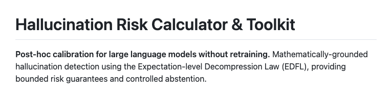 HallBayes 툴킷은 Expectation-level Decompression Law (EDFL) 라는 수학적 프레임워크를 기반으로 하며, bounded risk guarantees(리스크 상한 보장)와 controlled abstention(통제된 응답 거부)를 제공합니다. 즉, 단순히 “모델이 맞을 확률이 높다”는 수준을 넘어, 수학적으로 근거 있는 리스크 한계를 설정하고, 이를 기반으로 응답을 내보낼지 거부할지를 자동으로 판단합니다. 이러한 기능은 기업 환경에서 SLA(Service Level Agreement)를 지키거나, 안전성이 중요한 서비스에서 특히 유용합니다.