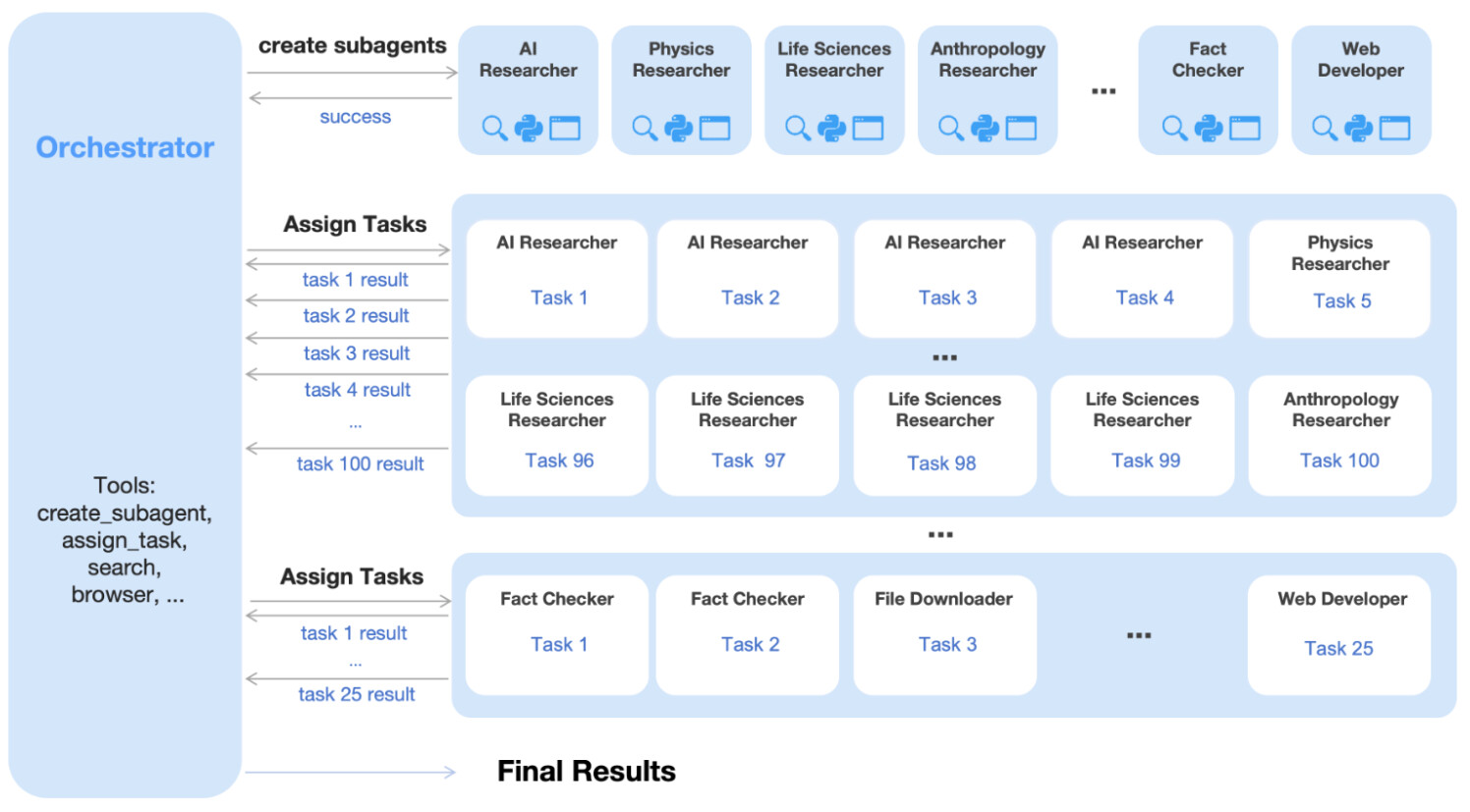 Agent Swarm은 이러한 순차적 실행의 병목을 해소하기 위해 오케스트레이터(Orchestrator) 및 하위 에이전트(Sub-agents) 구조를 도입했습니다. 오케스트레이터는 사용자로부터 복잡한 작업을 입력받으면, 이를 즉시 해결하려 하지 않고 여러 개의 작은 하위 문제로 분해합니다. 그리고 각 문제를 해결할 수 있는 전문화된 하위 에이전트를 동적으로 생성(Instantiate)하여 작업을 병렬로 할당합니다.
