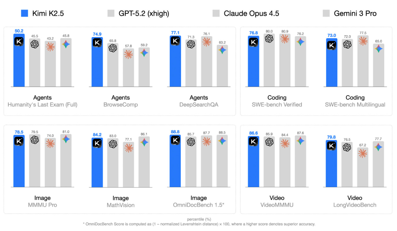 이러한 기술적 진보를 바탕으로 Kimi K2.5는 코딩, 시각적 추론, 긴 비디오 이해 등 다양한 벤치마크에서 GPT-5.2나 Claude Opus 4.5와 같은 최상위 모델들과 대등하거나 더 뛰어난 성능을 입증하고 있습니다.