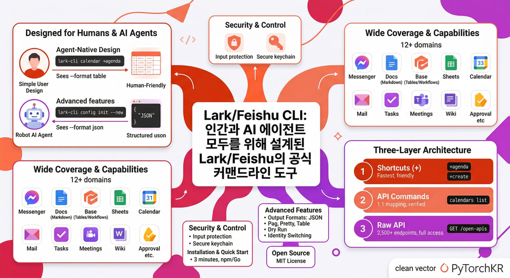 Lark/Feishu CLI(일명 lark-cli)는 Larksuite 공식 팀에서 직접 개발하고 유지보수하는 오픈소스 기반의 커맨드라인 도구입니다. 이 프로젝트의 가장 핵심적인 철학은 단순한 터미널 관리 도구에 머무는 것이 아니라, 사람(개발자)과 AI 에이전트 모두가 직관적이고 효율적으로 사용할 수 있도록 근본부터 설계되었다는 점입니다.