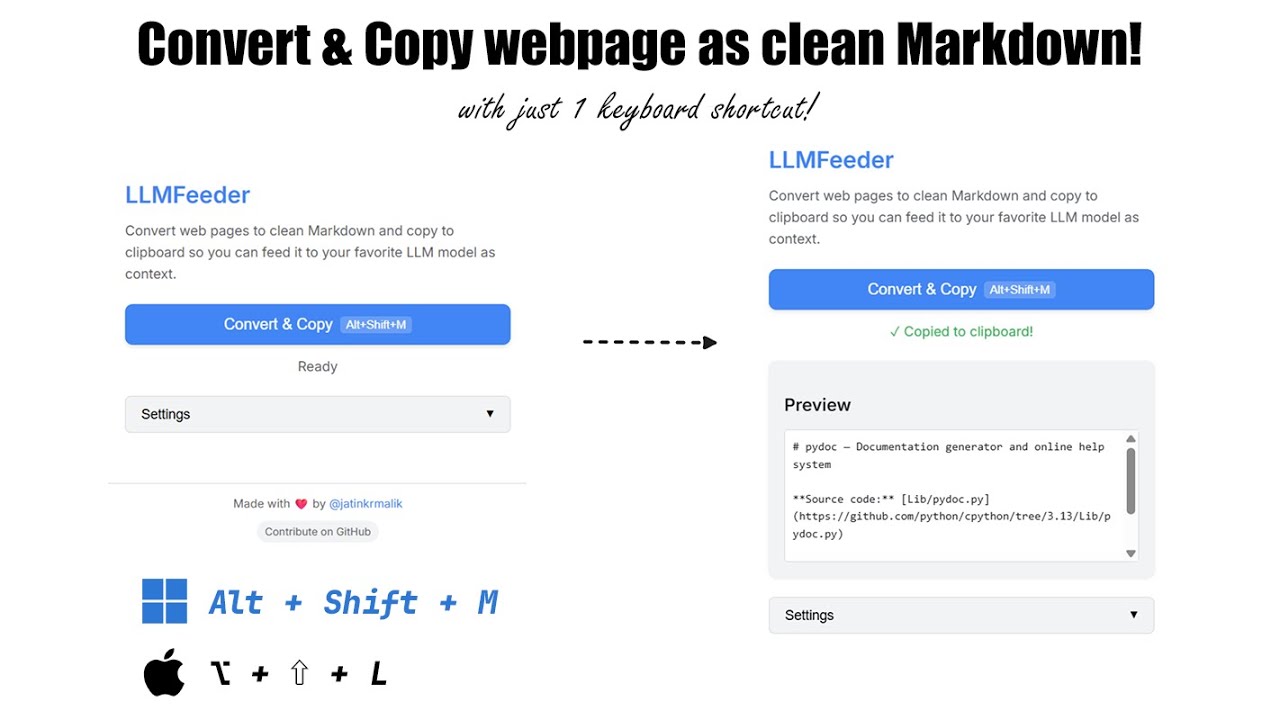 LLMFeeder는 웹페이지의 주요 콘텐츠를 추출하여 Markdown 형식으로 변환하고, 이를 클립보드에 복사해주는 브라우저 확장 프로그램입니다. Chrome과 Firefox에서 모두 사용할 수 있으며, 모든 작업은 로컬에서 처리되어 개인정보 보호 측면에서도 안전합니다. 특히, LLM에 입력할 컨텍스트를 준비할 때 매우 유용하게 활용할 수 있습니다.