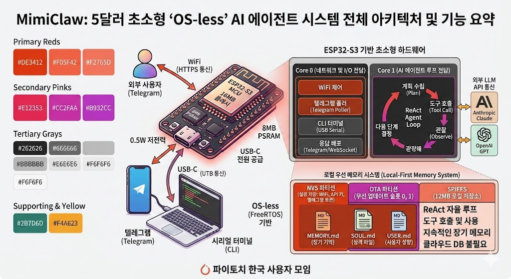 MimiClaw는 이러한 기존의 패러다임을 완전히 뒤집는 혁신적이고 흥미로운 오픈소스 프로젝트입니다. 이 프로젝트는 단돈 5달러(약 7천 원) 수준의 극도로 저렴하고 전력 소모가 적은 ESP32-S3 마이크로컨트롤러 유닛(MCU) 위에서 구동되는 개인용 AI 어시스턴트 펌웨어를 제공합니다. 가장 놀라운 점은 무거운 운영체제나 Node.js 환경에 전혀 의존하지 않고, 오직 순수 C 언어와 실시간 운영체제인 FreeRTOS만을 사용하여 이른바 베어메탈(Bare-metal)에 가까운 환경에서 복잡한 AI 에이전트 루프를 성공적으로 구현해 냈다는 사실입니다. 사용자는 보드에 USB 케이블로 전원(불과 0.5W 소모)만 공급해 주면, 24시간 내내 켜져 있으면서 로컬 플래시 메모리에 기억을 저장하고 Telegram을 통해 언제든 즉각적으로 대화할 수 있는 나만의 물리적 AI 비서를 갖게 됩니다.