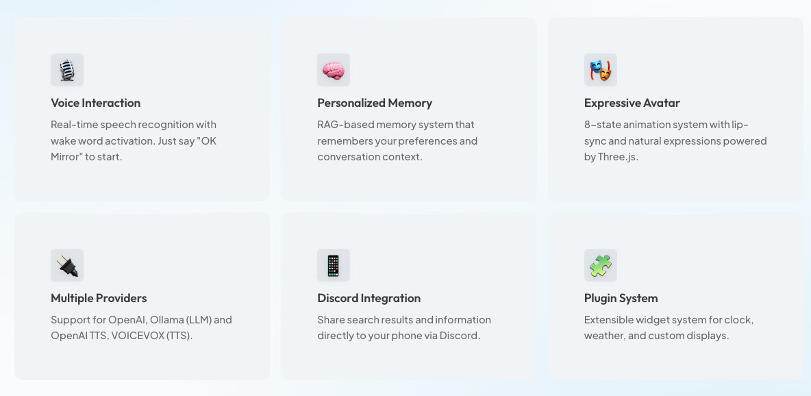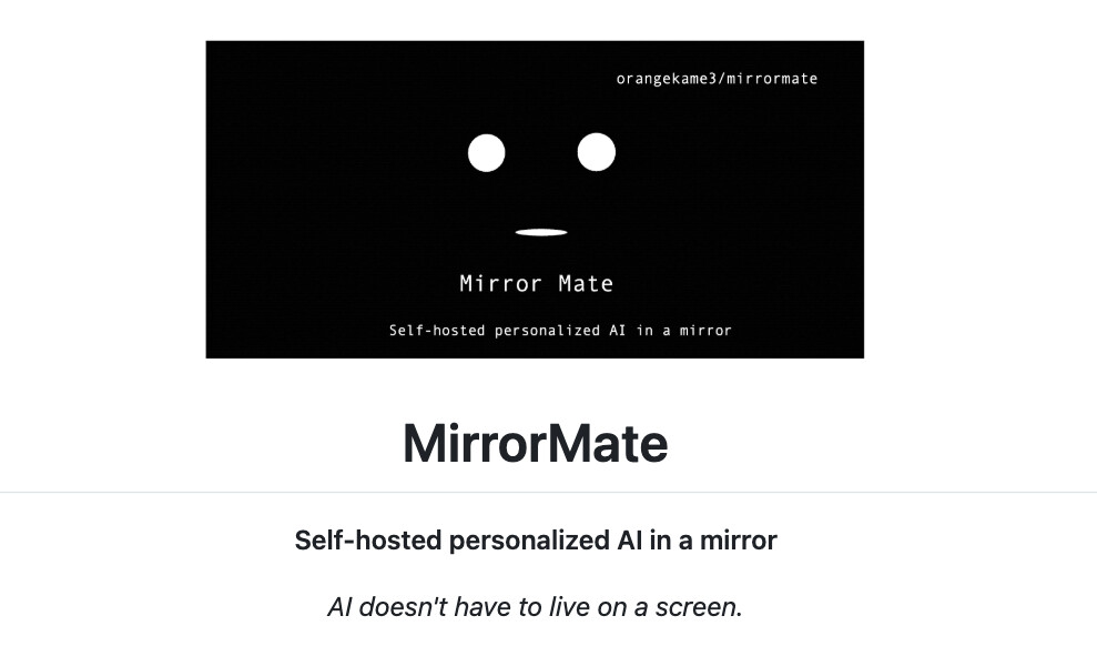 MirrorMate는 단순히 정보를 표시하는 디스플레이를 넘어, 거울 속에 상주하며 사용자와 대화하고 교감하는 개인화된 반려 AI(AI Companion) 프로젝트입니다. 이 오픈 소스 프로젝트는 사용자가 자신의 거울을 통해 AI와 자연스럽게 소통할 수 있도록 설계되었으며, 특히 프라이버시와 현실감에 중점을 두고 있습니다.