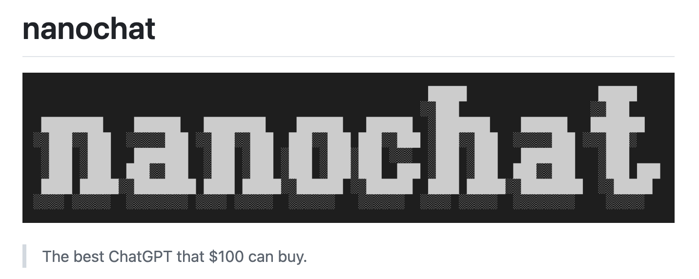 nanochat은 前 OpenAI의 AI 연구자이자 前 테슬라 AI 총괄 출신으로 유명한 Andrej Karpathy가 개발한 미니멀한 LLM(ChatGPT 유사 모델) 프로젝트입니다. 이 저장소의 목표는 “100달러로 ChatGPT를 만들어보자(The best ChatGPT that $100 can buy)” 라는 문구에서 드러나듯, 대규모 인프라 없이도 작동 가능한 저비용 LLM 구현을 실현하는 것입니다.