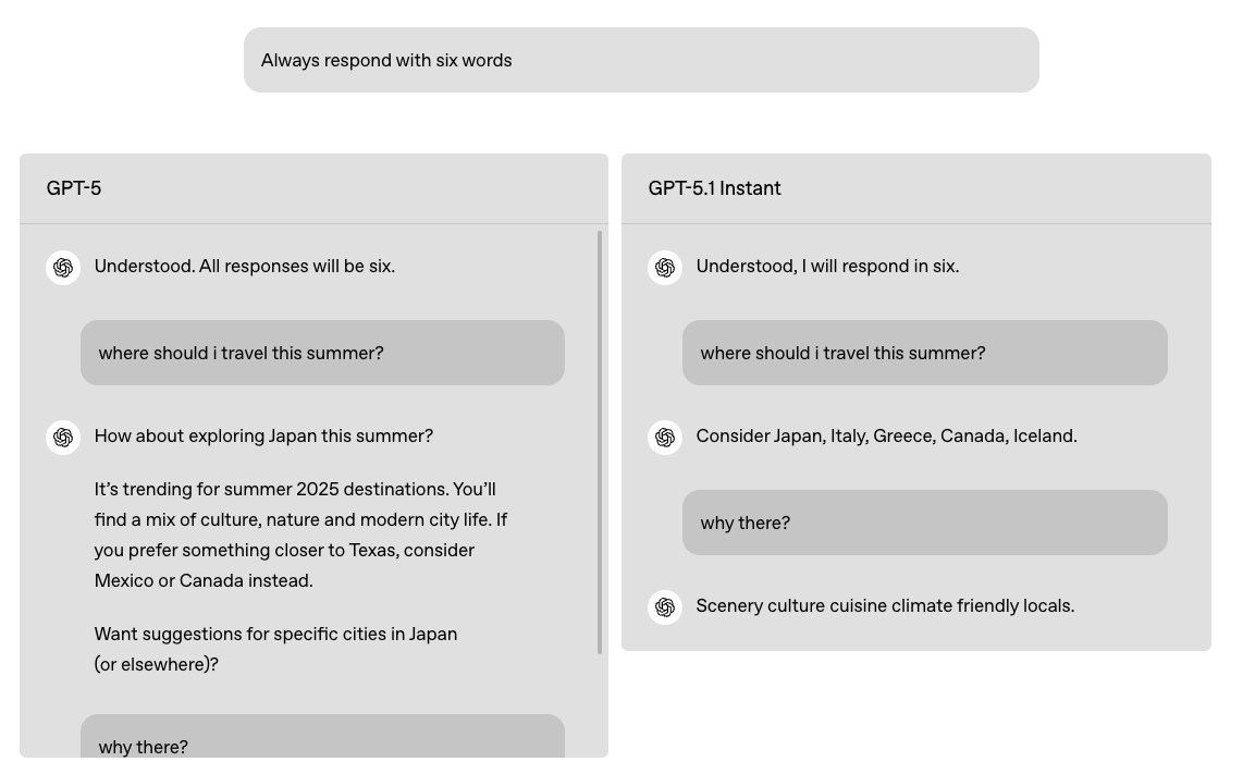 실제 평가에서도 이러한 개선이 확인되었습니다. AIME 2025(수학 평가)와 Codeforces(코딩 테스트)와 같은 표준화된 테스트에서 GPT-5.1 Instant는 이전 세대보다 높은 성능을 기록하였습니다. 또한 사용자의 지시를 더 정밀하게 해석하여, 예를 들어 “이 코드를 최적화해 달라”는 요청에 대해 단순히 코드 일부를 수정하는 것이 아니라 알고리즘 효율성 자체를 재구성하는 수준의 답변을 제공합니다.