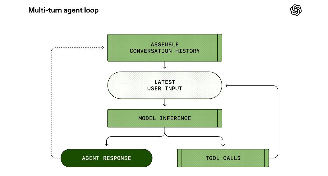 모델은 추가된 정보를 바탕으로 다음 행동을 결정하며, 더 이상의 도구 호출이 필요 없을 때까지 이 루프를 반복합니다. 최종적으로 어시스턴트 메시지가 출력되면 에이전트의 한 턴(Turn)이 완료되고 제어권이 다시 사용자에게 돌아옵니다.