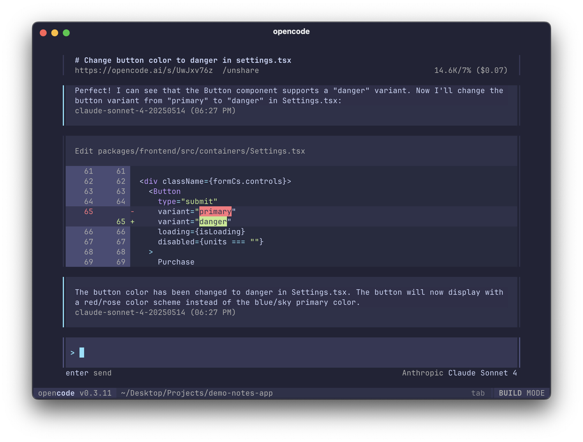 Opencode는 Plan 모드와 Build 모드를 지원합니다:
