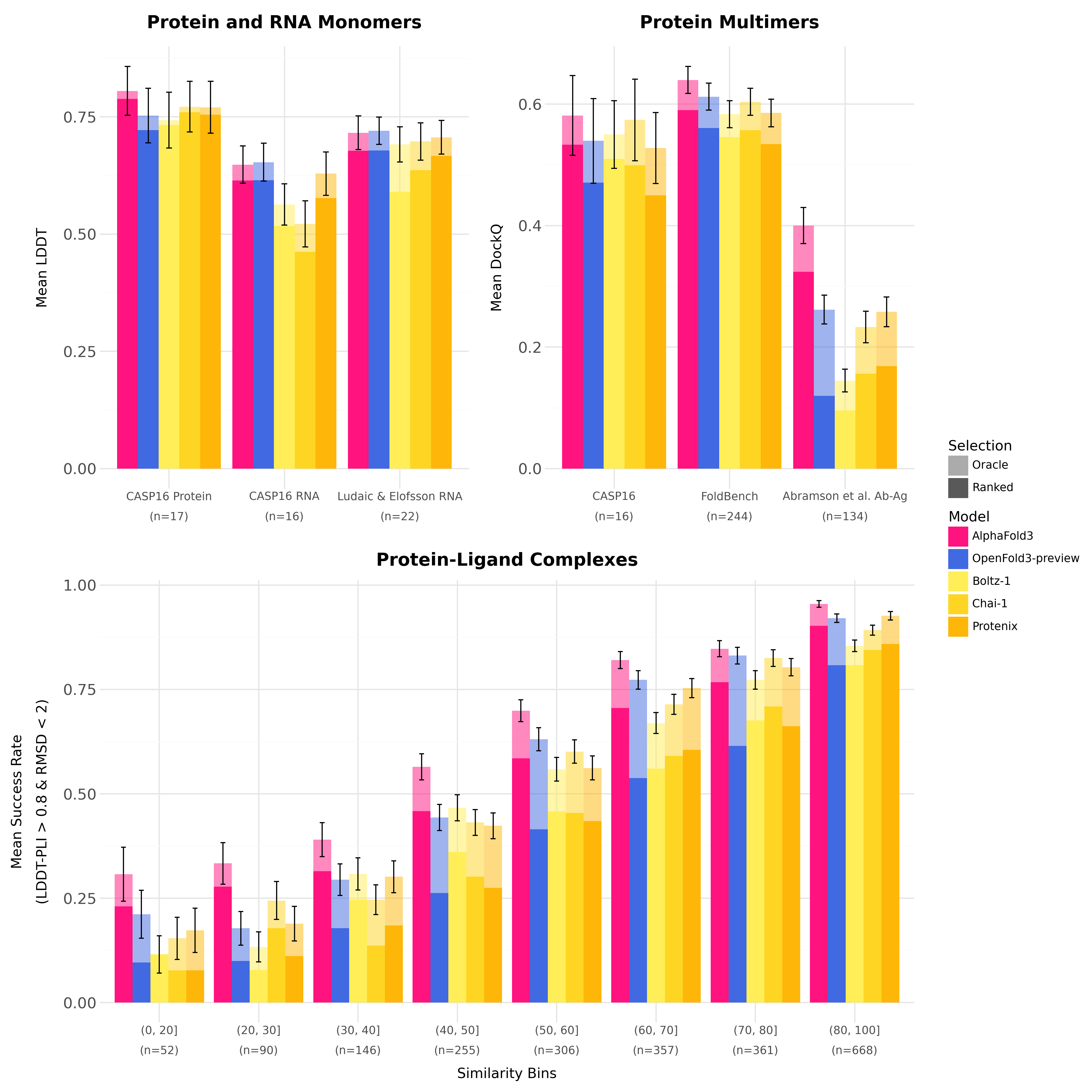 OpenFold3-preview는 현재까지 공개된 오픈소스 모델 중 가장 높은 수준의 RNA 구조 예측 성능을 달성했습니다. 특히 단백질 및 단백질-복합체 구조 예측에서도 기존 모델과 대등한 정확도를 보이며, AlphaFold3 수준의 결과를 재현하는 데 성공했습니다.