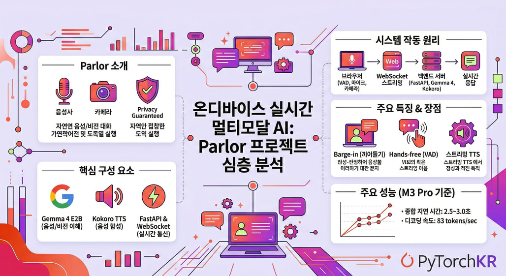 Parlor의 핵심 아이디어는 최신 경량 모델들의 발전을 활용하여 "로컬에서 실행 가능한 실시간 멀티모달 AI"를 구현하는 것입니다. Google DeepMind의 Gemma 4 E2B 모델이 음성과 화상 이해를 담당하고, Hexgrad의 Kokoro TTS가 텍스트를 자연스러운 음성으로 변환합니다.