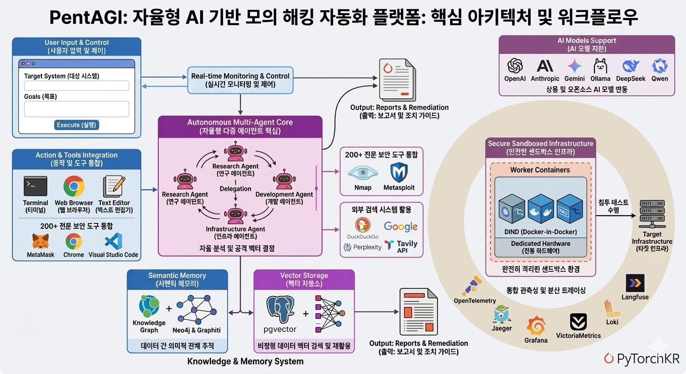 정보 보안 분야에서 모의 해킹은 시스템의 취약점을 사전에 식별하고 대응하기 위해 필수적인 과정으로 자리 잡고 있습니다. 하지만 이러한 테스트는 고도의 전문성을 갖춘 인력에 크게 의존하며 반복적이고 수동적인 작업에 많은 시간과 자원이 소모된다는 한계를 지니고 있었습니다. 이러한 문제를 해결하기 위해 등장한 PentAGI는 최신 인공지능 기술을 기반으로 복잡한 보안 테스트 작업을 사람의 개입 없이 독립적으로 수행할 수 있도록 설계된 자율형 AI 에이전트 시스템입니다. PentAGI는 오픈소스로 제공되며 정보 보안 전문가와 연구자들에게 실용적인 도구를 제공하는 것을 목표로 합니다.