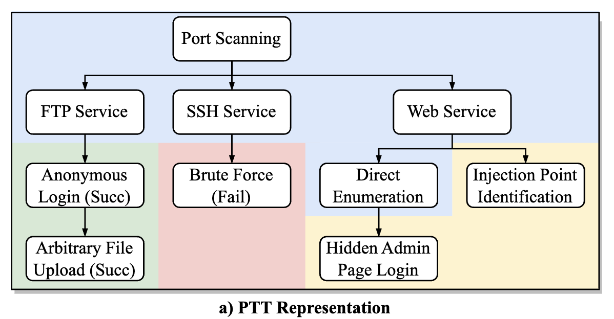 추론 모듈은 마치 모의해킹 팀의 리더(Team Lead)와 같은 역할을 수행합니다. 이 모듈은 구체적인 공격 코드를 작성하거나 도구를 실행하는 세부 작업에는 관여하지 않는 대신, 전체적인 테스트의 흐름과 상태를 관리하는 데 집중합니다. 핵심은 PTT(Pentesting Task Tree) 라는 데이터 구조입니다. 추론 모듈은 정찰 단계에서 수집된 정보(오픈된 포트, 서비스 버전 등)를 바탕으로 작업 트리를 생성하고, 각 단계의 성공/실패 여부에 따라 동적으로 트리를 업데이트합니다. 덕분에 LLM의 고질적인 문제인 문맥 손실을 방지하고, 전체 공격 시나리오(Kill Chain)를 일관성 있게 유지할 수 있습니다.