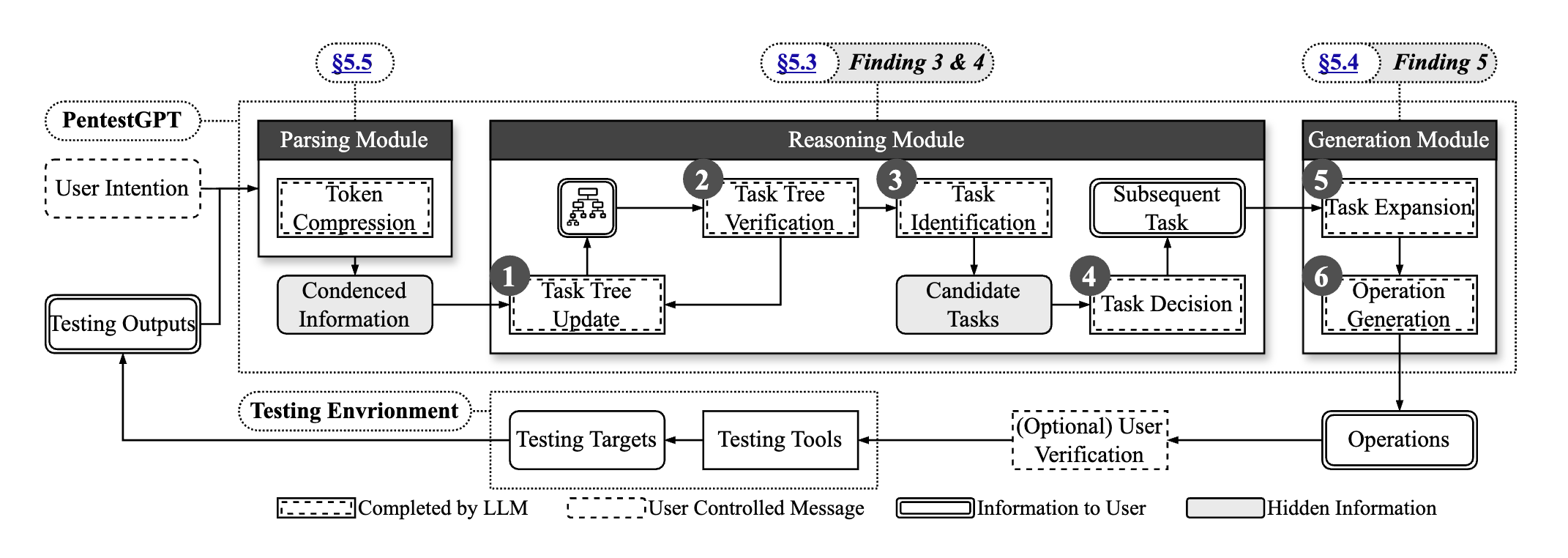 보안 도구(Nmap, Nikto, Dirbuster 등)의 실행 결과는 매우 방대하고 복잡한 경우가 많습니다. 이를 가공 없이 LLM에 입력하면 토큰 제한(Token Limit)을 초과하거나, 핵심 정보가 노이즈에 묻혀버리는 문제가 발생합니다. 파싱 모듈(Parsing Module)은 이러한 문제를 해결하기 위해 도구의 출력 결과(Raw Output), 소스 코드, HTTP 응답 등을 분석하여 핵심 정보만을 추출하고 요약합니다. 이렇게 정제된 정보는 다시 추론 모듈로 전달되어 PTT를 업데이트하는 데 사용됩니다. 결과적으로 파싱 모듈은 제한된 토큰 자원을 효율적으로 사용하면서도 에이전트가 상황을 정확하게 인식하도록 돕는 필수적인 역할을 수행합니다.