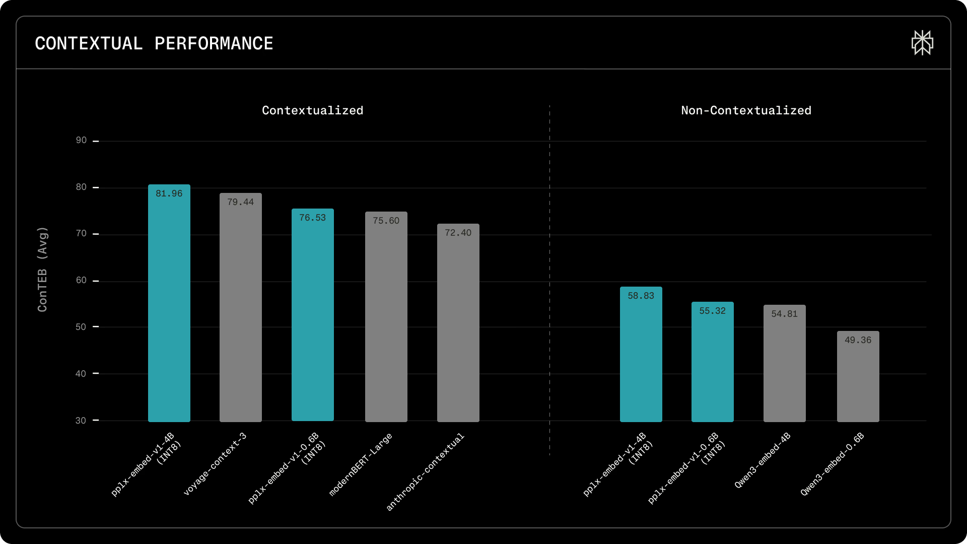 또한, 문서의 글로벌 컨텍스트를 반영하는 능력을 평가하는 상황 인식 리트리벌 벤치마크에서는 81.96%의 점수를 달성하여 voyage-context-32 및 Anthropic Contextual3와 같은 상황 인식 모델들을 앞질렀습니다.