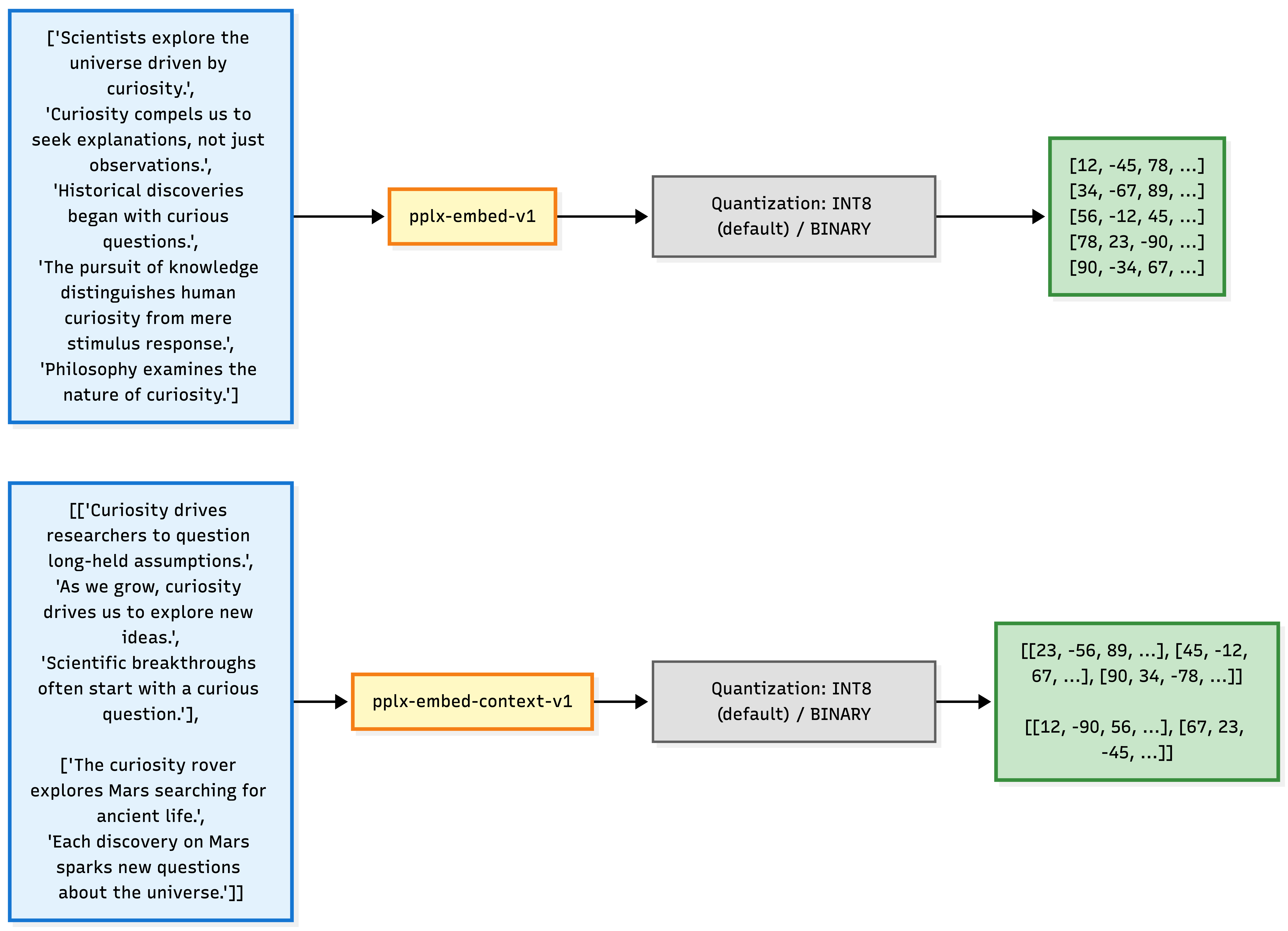 pplx-embed 모델 제품군은 사용 사례에 따라 명확히 구분하여 적용할 때 최상의 결과를 얻을 수 있습니다. 먼저, 검색 쿼리나 개별적인 문장, 또는 서로 연관성이 없는 독립적인 문서를 인덱싱할 때는 표준 모델(pplx-embed-v1)을 사용하는 것이 적합합니다.