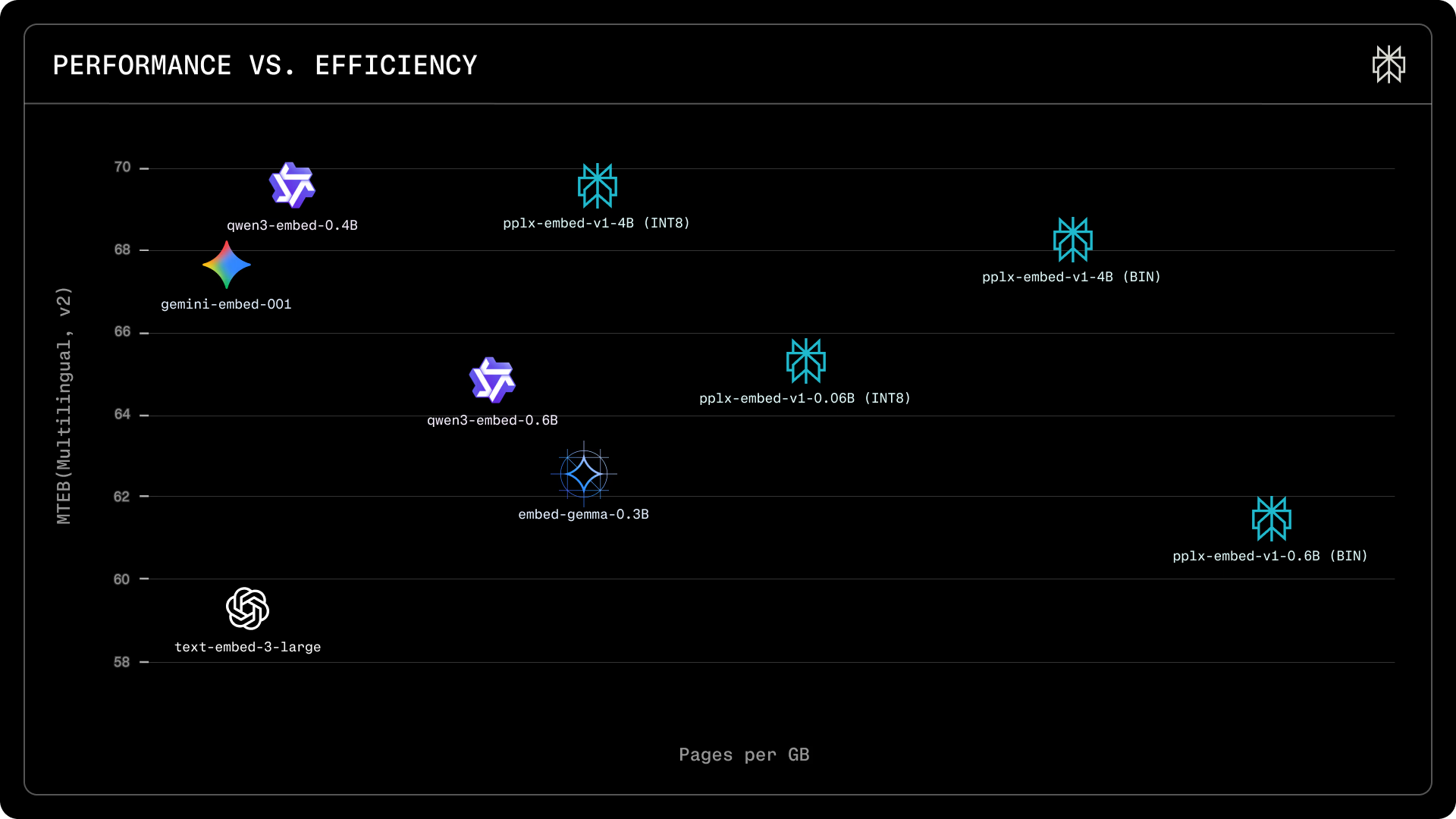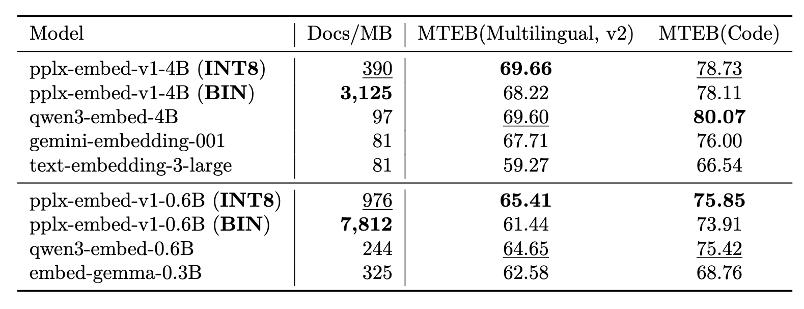 pplx-embed 모델들은 수십억 개의 웹 페이지를 처리하고 저장하는 데 발생하는 막대한 스토리지 비용 문제를 해결하기 위해, 양자화 인식 학습 기법을 적용하여 설계되었습니다. 사후에 압축하는 방식을 사용할 때 발생할 수 있는 성능 저하를 방지하기 위해 학습 단계에서부터 네이티브 INT8 및 이진 양자화 임베딩을 출력하도록 만들어졌으며, 이를 통해 32비트 부동소수점 대비 저장 공간을 각각 4배에서 최대 32배까지 절감할 수 있게 해줍니다.