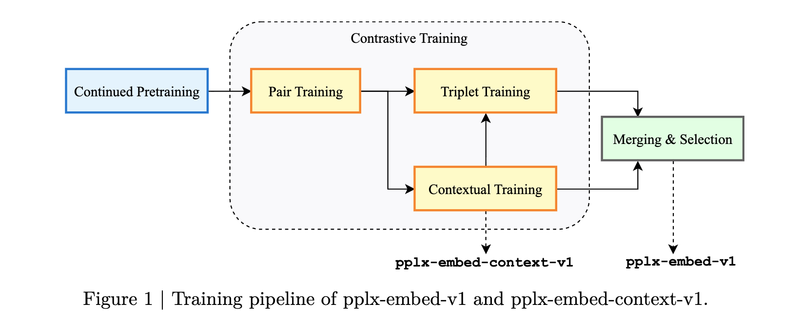 두 번째로 상황 인식 학습(Contextual Training) 단계에서는 청크 단위의 의미를 전체 문서 수준의 컨텍스트와 연결하는 방법을 모델에 가르치며, 이 과정을 통해 상황 인식 전용 모델인 pplx-embed-context-v1이 산출됩니다.