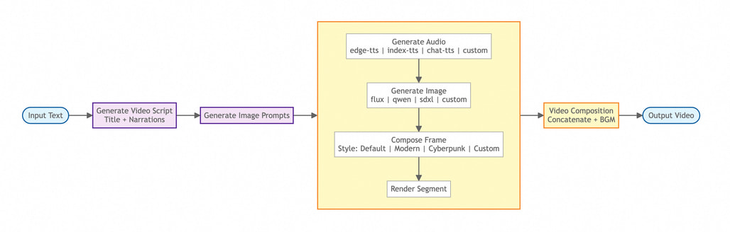 Pixelle-Video의 영상 생성은 스크립트 생성 → 이미지 계획 → 프레임 처리 → 영상 합성의 4단계로 구성됩니다. 사용자가 주제를 입력하면 LLM이 먼저 내레이션 스크립트를 생성하고, 각 문장에 어울리는 이미지를 AI로 생성합니다. 이후 TTS(Text-to-Speech) 엔진으로 내레이션을 음성으로 변환하고, 배경음악과 함께 최종 영상으로 합성하는 방식입니다. 각 단계는 독립적으로 설정 가능하며, 이미지 생성 모델, TTS 엔진, 영상 템플릿을 자유롭게 교체할 수 있습니다.