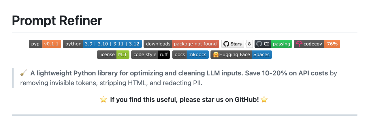 비슷한 기능을 하는 라이브러리로는 clean-text, pii-sanitizer, html2text 등이 있지만, Prompt Refiner는 이 모든 기능을 하나의 파이프라인으로 통합하여 제공합니다. 즉, HTML 정리, 공백 압축, 중복 제거, 개인정보 마스킹, 토큰 수 분석까지 한 번에 처리할 수 있습니다. 게다가 LLM API의 **토큰 비용 절감율(최대 15~40%)**을 실제 벤치마크 데이터로 제시한다는 점에서 실용성이 높습니다.